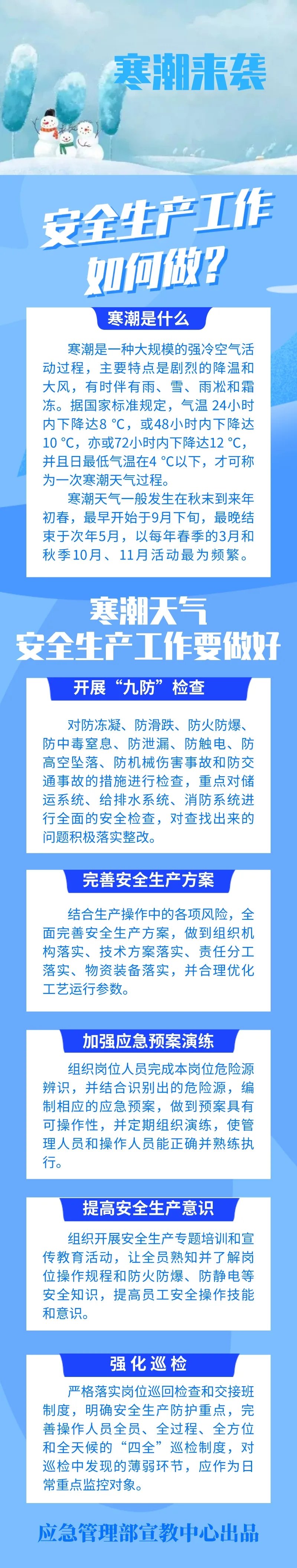 寒潮是一种大规模的强冷空气活动过程,主要特点是剧烈的降温和大风,有时伴有雨、雪和霜冻等,且因低温雨雪冰冻灾害链复杂,极易导致次生、衍生灾害。寒潮来袭,如何确保生产安全?这份指南请收好。