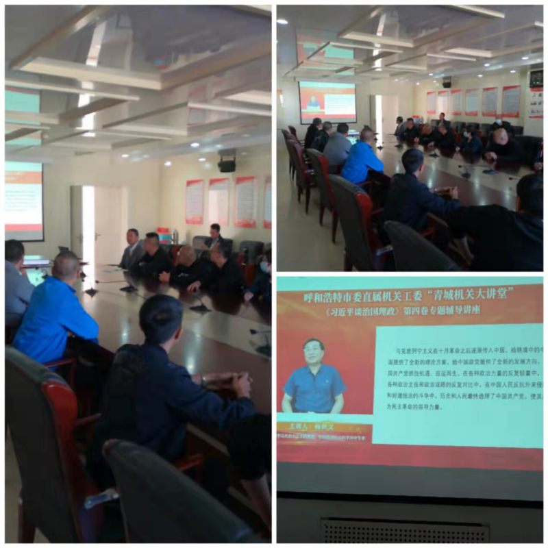 为更好的引导我办党员干部学深悟透,用理论武装头脑指导实践,深入学习《习近平谈治国理政》第四卷,让习近平新时代中国特色社会主义思想根植于每一名党员干部思想意识深处,根据市委直属机关工委统一安排,呼市人防办于9月16日、9月23日分别组织党员干部通过“青城机关大讲堂”网上专题讲座,以视频方式学习了中国人民大学马克思主义学院教授、中国人民大学习近平新时代中国特色社会主义思想研究院副院长王向明博士主讲的《全心全意为人民服务--中国共产党人永恒不变的庄严承诺》和北京师范大学马克思主义学院教授杨世文博士主讲的《毫不动摇 坚持党的全面领导》的专题视频讲座。